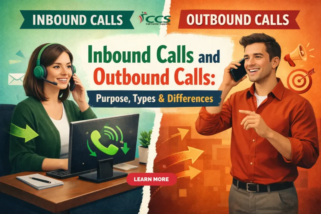Nowadays, phone calls play a crucial role in Business Communication. Companies use calls to speak with customers, address queries, offer support and promote services. There are many companies relying on inbound and outbound calls to manage their daily business. Inbound calls are those made by customers. Outbound calls are calls that companies make to customers. Both inbound and outbound calls are important, but they are used for different purposes. To answer these calls professionally, Many companies use an inbound and outbound call center, where well-trained agents handle customer communication. Before we explain how inbound calls and outbound calls are different, it is important to know their purposes and how they work. What Are Inbound Calls? Customers made Inbound calls to a business. These calls are “incoming,” meaning the first step is taken by the customer. Customers call a company when they need help, have a question or encounter a problem. For example, a customer may call to inquire about a bill or verify an order, report a problem or request assistance. The challenge is that inbound calls tend to come from people who need help, so agents must be trained to listen, understand and have the right answers. Purpose of Inbound Calls Inbound calls serve many important purposes: To answer customer questions To give support and guidance To solve problems To explain a product or service details To handle complaints To offer technical help To maintain good relationships with customers The primary objective is to assist the customer and ensure they are satisfied. To understand how inbound calls and outbound calls are different, we will look into their types. Types of Inbound Calls Inbound calls are not the same for every business. There are different categories of inbound and outbound calls based on what the customer requires. The following are the different Categories of Inbound Calls: 1. Customer Service Calls Customer service call center are the most common type of inbound call. Customers call when they need help, advice or support. These calls may include issues about product, service, delivery time, guarantee or return policy. The agents must be calm and courteous while taking these calls. They must listen carefully, explain clearly and solve the customer’s problem without delay. Good customer service calls can help build trust and reduce customer frustration. 2. Inquiry and Information Calls These calls are made by only customers when they need information. They may ask about: Product features Pricing Service availability Booking details Store locations Business hours The aim of these calls is to provide correct and simple information. When information is not clear, potential customers may lose interest or become confused. So the agent must give a clear and confident answer. 3. Technical Support Calls Technical support call center are more detailed and need step-by-step guidance. Customers call when they face: Device errors Software problems Login issues Network problems Installation or setup difficulties The agent must be knowledgeable about the service issue and help the customer make the right decision. These calls require a lot of patience because customers may be stressed or frustrated. An excellent support call can prevent recurring problems and improve customer satisfaction. 4. Order and Booking Calls Customer calls to place new orders, change existing orders or check delivery status. Such calls are common in e-commerce, food delivery, travel and online service platforms. Order-related inbound calls may include: Placing a new order Updating delivery address Asking about delivery time Cancelling an order Tracking shipment These calls need to be accurate because even minor errors can cause delays or incorrect deliveries. 5. Billing and Payment Calls Billing calls happen when customers have a concern about: Wrong charges Payment failure Invoice details Refund requests Balance information These requests need to be cross-checked on customer records. The agent must explain charges clearly so the customer can easily understand what they are being charged for. 6. Complaint Handling Calls Customers call to complain when something goes wrong. It may be poor service, damaged product, delay in arrival, the incorrect order or technical issues. These calls must be taken calmly and patiently. The agent has to listen, apologise and offer a solution. “A complaint call is the business’s opportunity to improve and retain customers.” 7. Account and Subscription Calls Customers call to update their personal information, upgrade plans, reset passwords and cancel subscriptions. Agents are required to verify identity before making any changes to keep customers’ data private. These are the types of inbound calls that help businesses understand what customers require and give them support. What Are Outbound Calls? Outbound calls are those that the business makes to customers. These are “outgoing” calls. Businesses make outbound calls to customers for sales, marketing, feedback and more. Outbound calls help a business grow by reaching new or existing customers. Compared to inbound calls, agents need to be more assertive and convincing in outbound calls. It explains how inbound calls and outbound calls are different from each other. Purpose of Outbound Calls Outbound calls are used to: Increase sales Promote services Find new leads Follow up with customers Collect feedback Confirm appointments Remind customers of a payment or renewal. The primary objective of making outbound calls is to increase engagement and boost business growth. Types of Outbound Calls Outbound calls also have several categories. Each category of inbound and outbound calls is designed to meet a different business requirement. Here are the main types of outbound calls: 1. Sales Calls Sales calls are made to sell a product or service. Agents reach out to customers, explain benefits, show offers and persuade them to bu